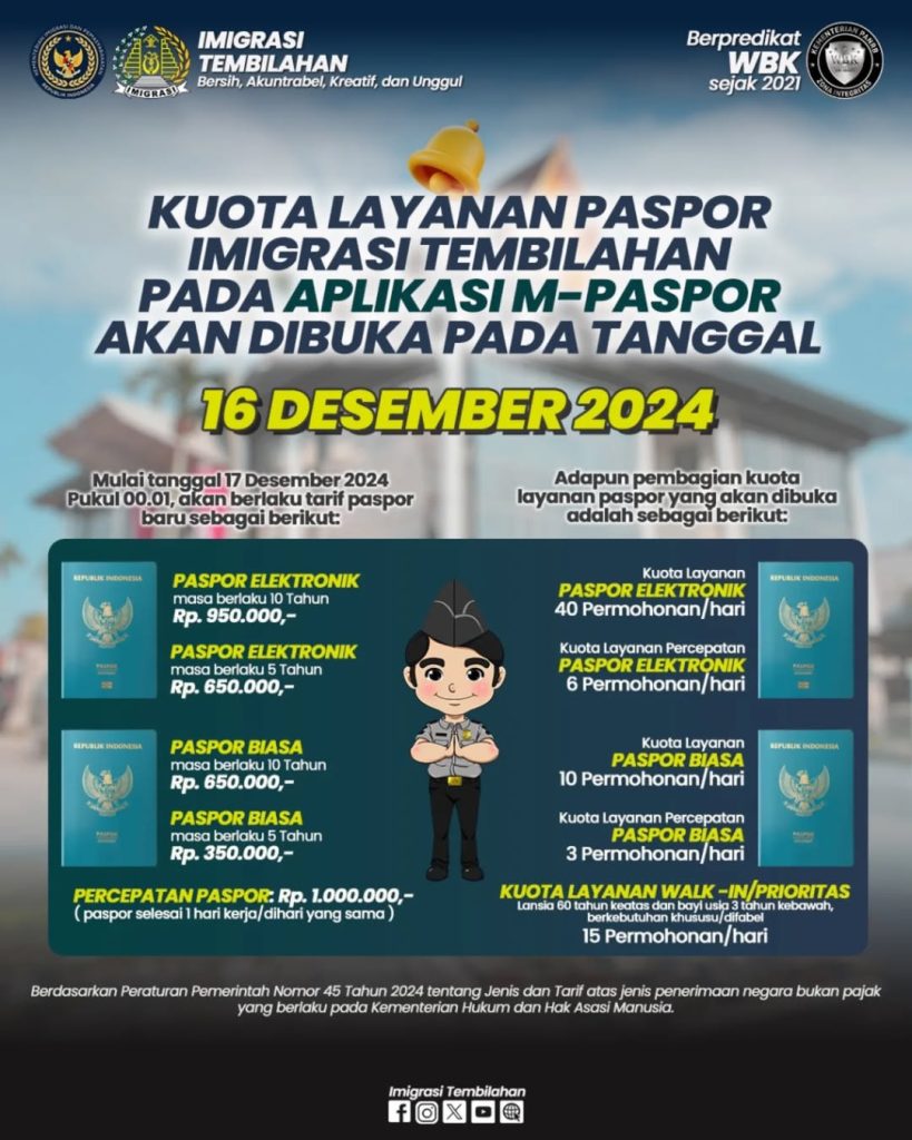 Hai sahabatmido Kuota Pelayanan Paspor Imigrasi Tembilahan pada Aplikasi M-Paspor akan dibuka pada tanggal 16 Desember 2024 ya, dan pada tanggal 17 Desember 2024 nanti sudah mulai diberlakukan tarif baru penerbitan Paspor RI, sahabatmido juga bisa memilih masa berlaku paspor 5 tahun atau 10 tahun.