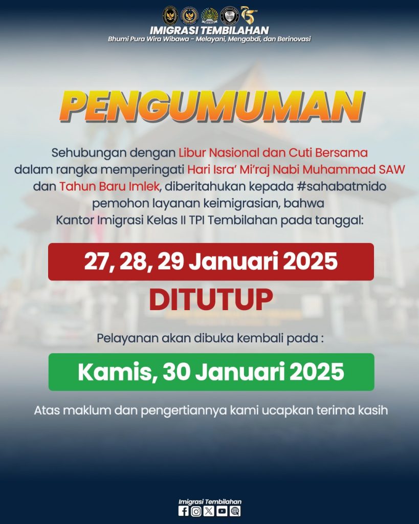 Hai #sahabatmido ,Sehubungan dengan Libur Bersama dan Cuti Bersama memperingati Isra’ Mi’raj Nabi Muhammad SAW, dan Tahun Baru Imlek. Layanan Kantor Imigrasi Tembilahan untuk sementera DITUTUP pada tanggal 27-29 Januari 2025, dan akan dibuka kembali pada hari Kamis, 30 Januari 2025. Terima Kasih atas maklum dan pengertiannya.