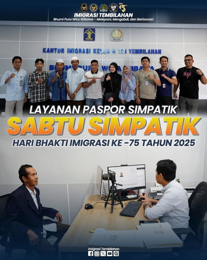 Tembilahan – Kantor Imigrasi Kelas II TPI Tembilahan (Imigrasi Tembilahan) pada Sabtu ini (25/01/2025), Kembali menggelar kegiatan Paspor Simpatik. Kegiatan Paspor Simpatik ini merupakan yang ke empat kalinya dilaksanakan selama bulan Januari, dan merupakan gelaran terakhir dari rangkaian kegiatan peringatan Hari Bhakti Imigrasi Ke-75 Tahun 2025, yang akan jatuh pada esok hari 26 Januari.