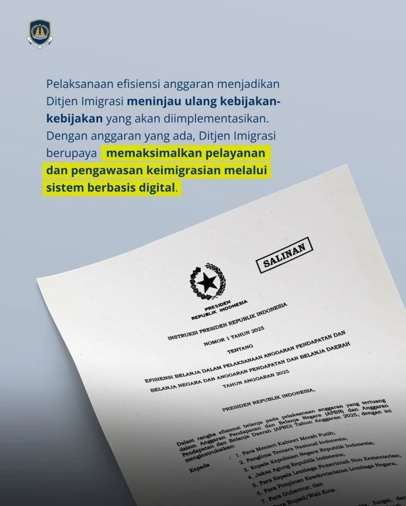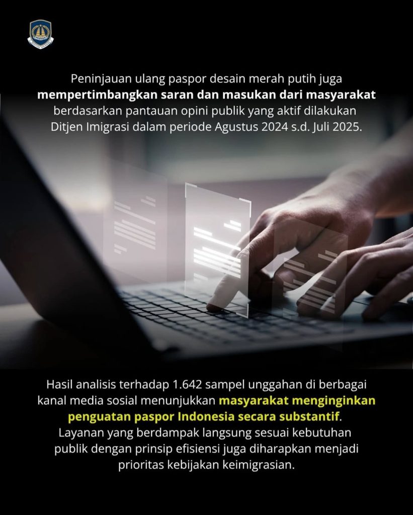 Ditjen Imigrasi meninjau kembali implementasi paspor desain merah putih. Hal ini sejalan dengan Instruksi Presiden (Inpres) Nomor 1 Tahun 2025 tentang efisiensi anggaran bagi kementerian/lembaga serta sebagai respon terhadap aspirasi masyarakat. Pasca peluncuran desainnya (17/08/2024) lalu, Ditjen Imigrasi aktif memantau opini publik terkait kebijakan tersebut. Sejumlah sampel unggahan yang diambil di media sosial memperlihatkan kecenderungan masyarakat akan kebijakan yang berdampak lebih konkret serta selaras dengan prinsip efisiensi dan prioritas kebutuhan publik. Selain itu, masyarakat mengharapkan agar Pemerintah bisa lebih fokus pada penguatan penguatan posisi paspor Indonesia secara global. Kebijakan ini menjadi langkah responsif Ditjen Imigrasi terhadap masukan publik dan arahan pemerintah untuk efisiensi, sekaligus upaya memenuhi harapan masyarakat akan paspor Indonesia yang lebih kuat di kancah global.