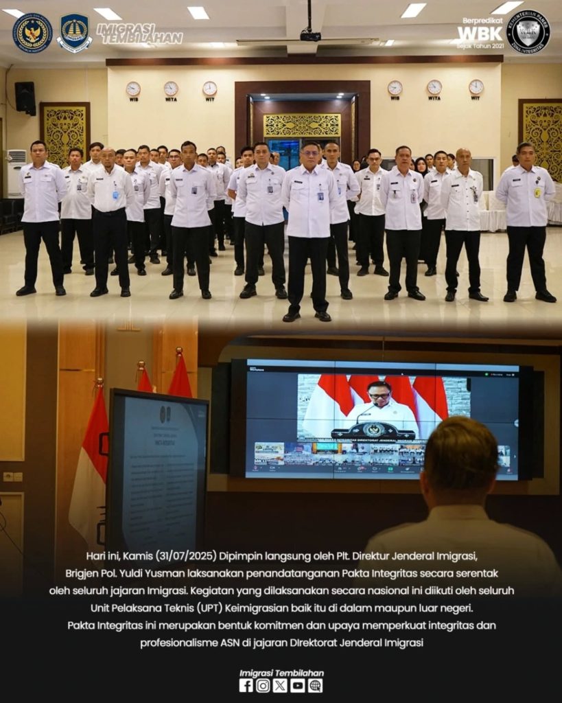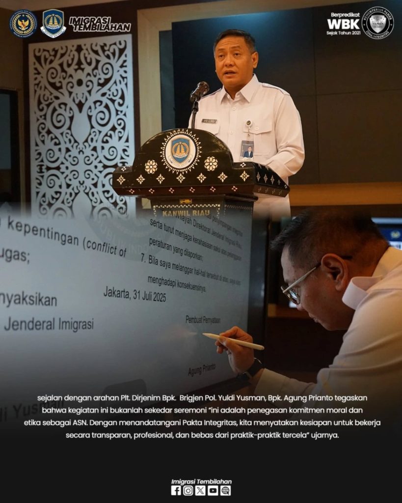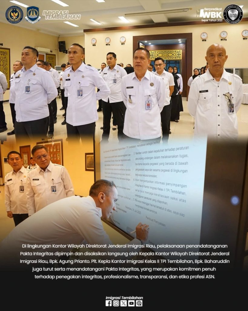 Kamis (31/07/2025) Kantor Imigrasi Kelas II TPI Tembilahan ( Imigrasi Tembilahan ) turut serta dalam penandatanganan Pakta Integritas oleh seluruh jajaran Direktorat Jenderal Imigrasi. Plt. Kepala Kantor Imigrasi Kelas II TPI Tembilahan, Bpk. Baharuddin tandatangani Pakta Integritas yang disaksikan langsung oleh Kepala Kantor Wilayah Direktorat Jenderal Imigrasi Riau, Bpk. Agung Prianto. Informasi selengkapnya pada infografis berikut ini.